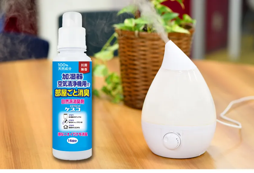 「自然派消臭剤ケスコ加湿器・空気清浄機用」はタンクに適量いれることで、部屋全体の加湿と同時に消臭を行ってしまうという、新しいタイプの消臭剤です。