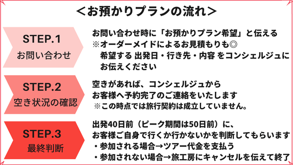 オーダーメイドの旅を提供するトラベル・コンシェルジュ・カンパニー、株式会社旅工房(東京都豊島区、代表取締役会長兼社長:高山泰仁)は、海外ツアーの催行再開に備え、ご出発40日前(ピーク期は50日前)まで申込金の支払いが不要な「お預かりプラン」を7月13日より受付を開始しました。