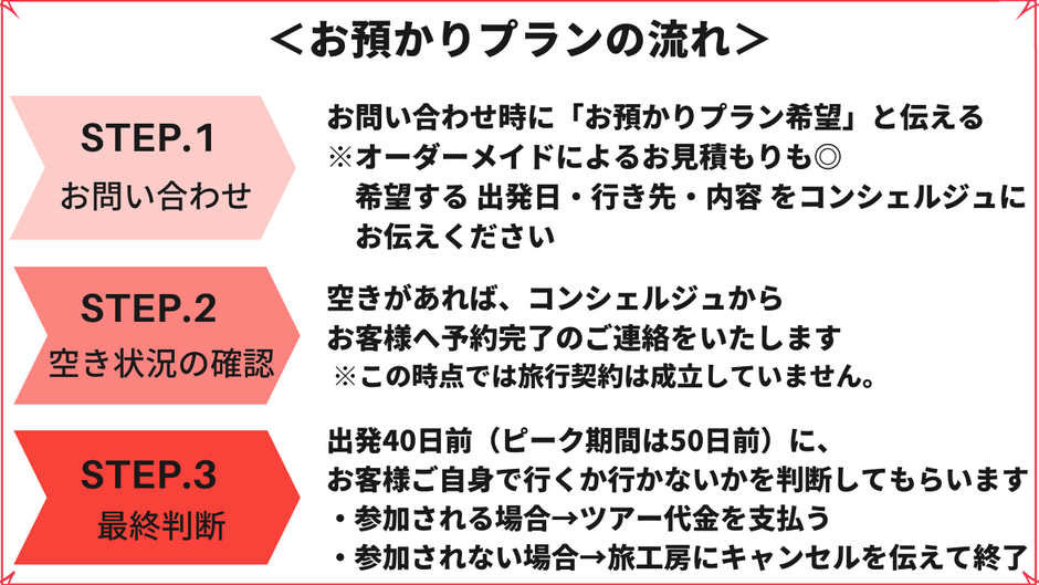 「お預かりプラン」では、ご予約時点での申込金の支払いが不要となり、日本や訪問地の出入国の規制や渡航危険レベルなどの状況を見て、じっくりとご旅行の予約の可否をご判断いただけます。「海外旅行には行きたいけれど、すぐに予約を決めるのは不安…。」というお客様の声にお応えし、希望のプランを無料で確保いたします。