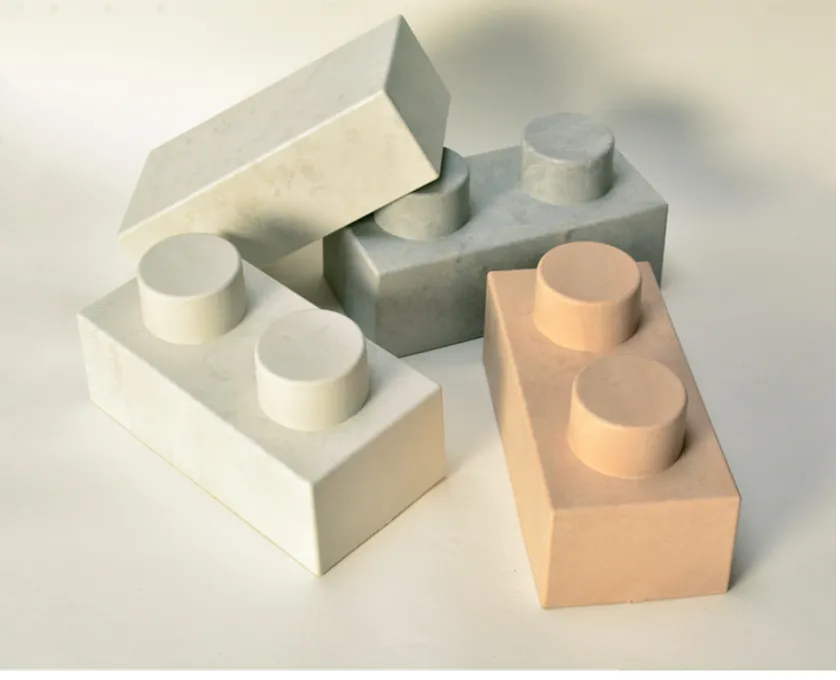 壁紙リサイクル材を70%配合したPVCコンパウンドを開発しました。 和紙の様な風合いとPVCならではの優しい柔らかさを備えたPVCブロックに加工しました。描く、塗る、つなげる、など自由な発想を育むアイテムです。