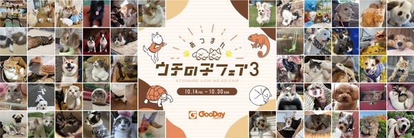 北部九州・山口に64店舗のホームセンター「グッデイ」を運営する株式会社グッデイ(代表:柳瀬隆志 本社:福岡市博多区)は、 事前キャンペーンで募集したワンちゃんネコちゃんなどの“ウチの子"のCMや掲示を行うペットグッズ・フードの祭典『あつまれ ウチの子フェア3』 (以下、ウチの子)を開催いたします。