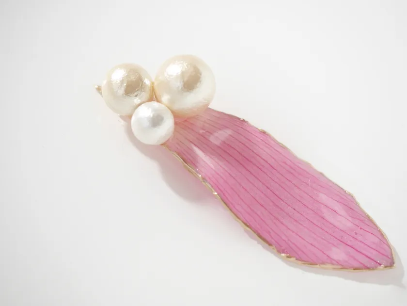 天然の蓮の花びら、そのままを加工したブローチです。4日間しか咲かない蓮の花を一輪ずつ丁寧に収穫しています。自然のものが故に花びらに傷がついたり、欠けてしまう事が多いですが、その中でも状態の良いものだけを厳選し加工しています。加工後、約1ヶ月から2ヶ月で徐々に色が変化してアンティークなパープルへと変化をしていきます。蓮の花びららしい、しっかりとした花脈(花びらの葉脈)が際立ってきますので、その変化もお楽しみください。