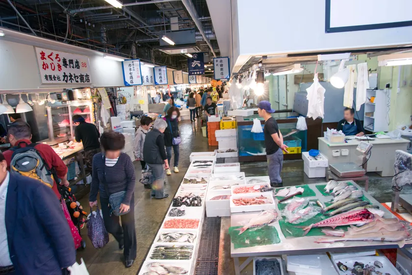 かつては天皇に魚介類を奉納したとも伝えられています。1年に1度、伝統的な儀式「献鯛式」という儀式が行われます。今もなお、昔ながらの市場文化と新鮮食材が揃い民間経営国内最大規模を誇ります。