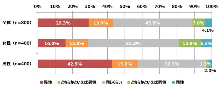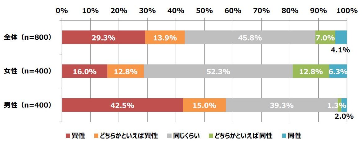 また、前問と比較をすると、男性は各割合が少なく、男性は男性に対してあまり興味がないのかもしれません。しかし、女性は男女ともに、つい“つい見てしまう”ところがあるようです。