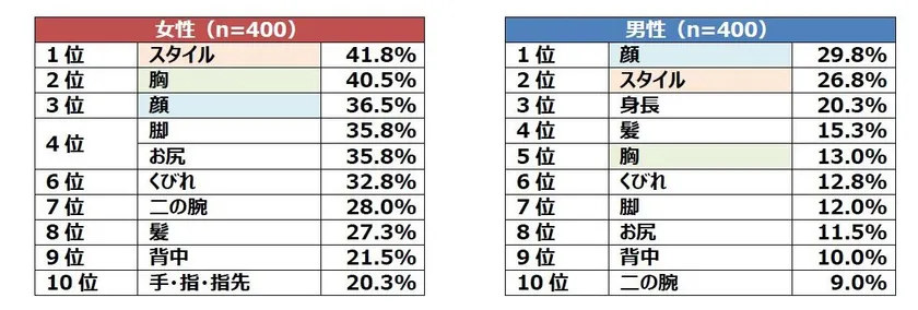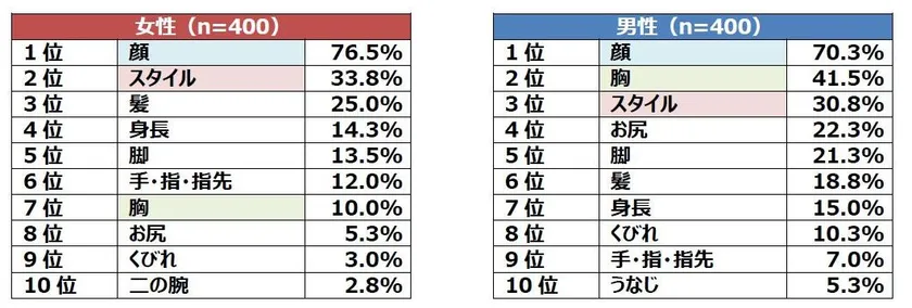 女性は次いで「スタイル」、「髪」、「身長」。一方、男性は「胸」、「スタイル」、「お尻」。男性が初対面の女性の「胸」や「お尻」をつい“つい見てしまう”ことが明らかになりました。