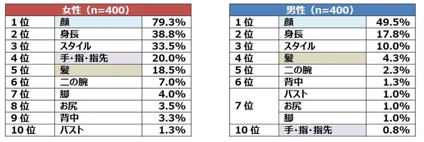 次いで、初対面の男性に対し、“つい見てしまう”ところをお聞きしました。その結果、初対面の女性に対するランキングとは異なり、男女ともに「顔」、「身長」、「スタイル」がTOP3となりました。次いで、女性は「手・指・指先」、男性は「髪」がランクインする結果になっています。