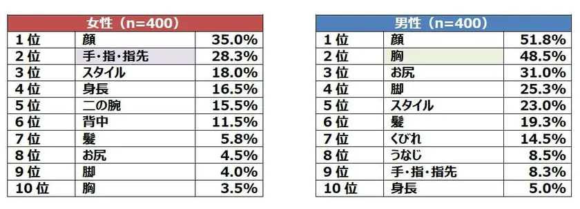 初対面の女性に対し、“つい見てしまう”ところは男女ともに「顔」が第1位となりました。しかし、第2位からは男女で多くの違いが見られる結果となりました。