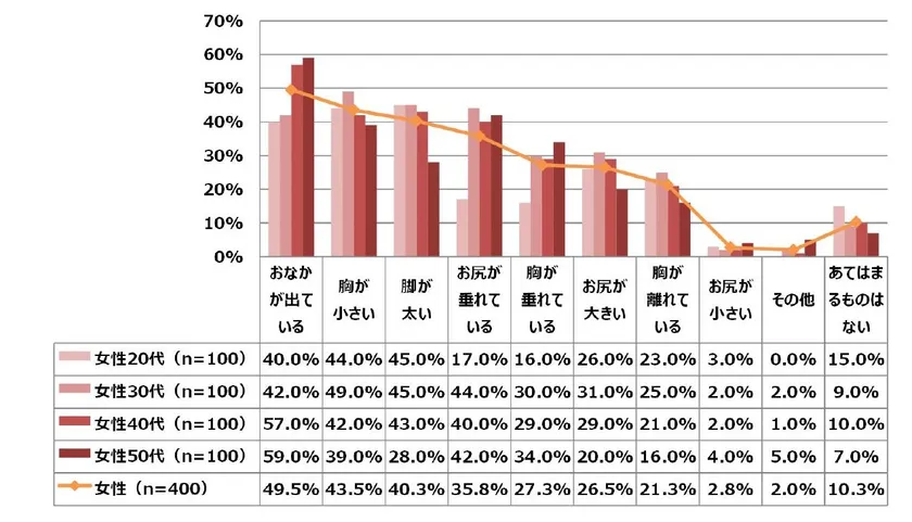 ボディラインに関する悩みについてでは「おなかが出ている」49.5%が最も多く、次いで「胸が小さい」43.5%。世代が上がる程、おなか周りが気になることも考察できます。