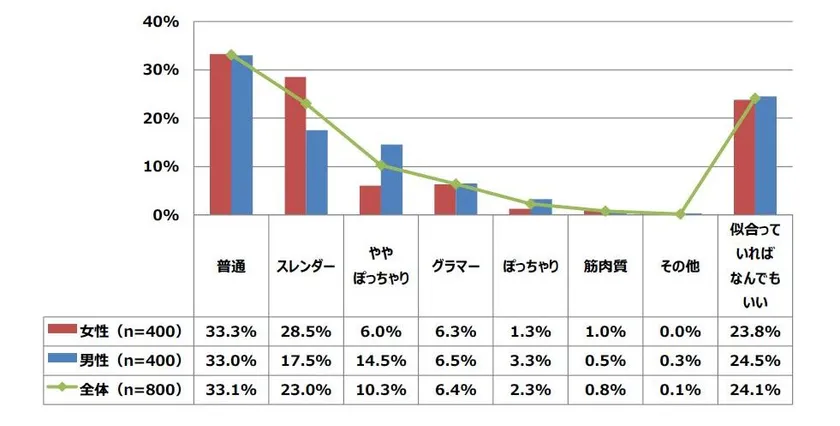 女性は「スレンダー」な体型へのあこがれが高いことが判明した一方、男性は「ややぽっちゃり」の方が好みだと思う方が多いという、正反対の結果となりました。
