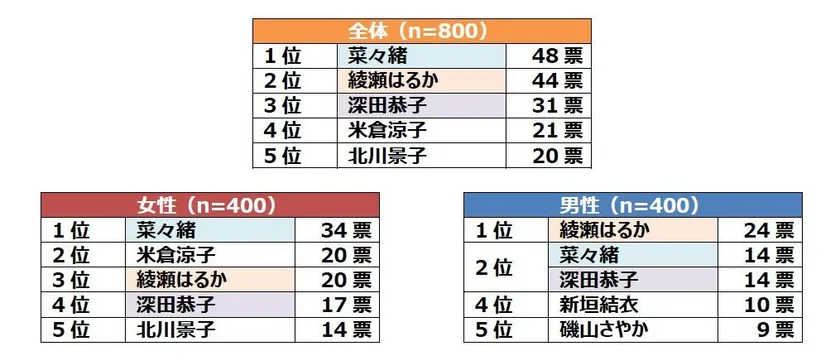 男性は「綾瀬はるか」さん「菜々緒」さん「深田恭子」さんが上位に。