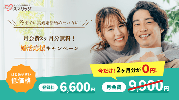 そしてこの度、スマリッジでは冬に向けて婚活を始める方々を応援するために「月会費2ヶ月分無料!婚活応援キャンペーン」と題し、期間内のご登録の方へ通常9,900円(税込)の「10・11月分の月会費」が「0円」になるキャンペーンを実施いたします。ぜひこのお得な機会にスマリッジをご利用ください。