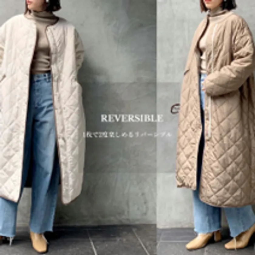 今シーズンのトレンドアイテムとして注目のノーカラーのキルティングコート。表裏でカラーが異なるリバーシブル仕様になっているので、印象を変えた様々な着こなしを楽しめます。ゆとりのあるサイズ感なのでボリュームのあるニット等、どのようなインナーでも楽に着られるのも嬉しいポイント。シンプルなデザインながら、フロント部分やポケット、袖先等に施されたパイピングが高見え効果も。ファスナー付きで寒さ対策もバッチリなので、今から真冬まで大活躍間違いなしのアウターです。