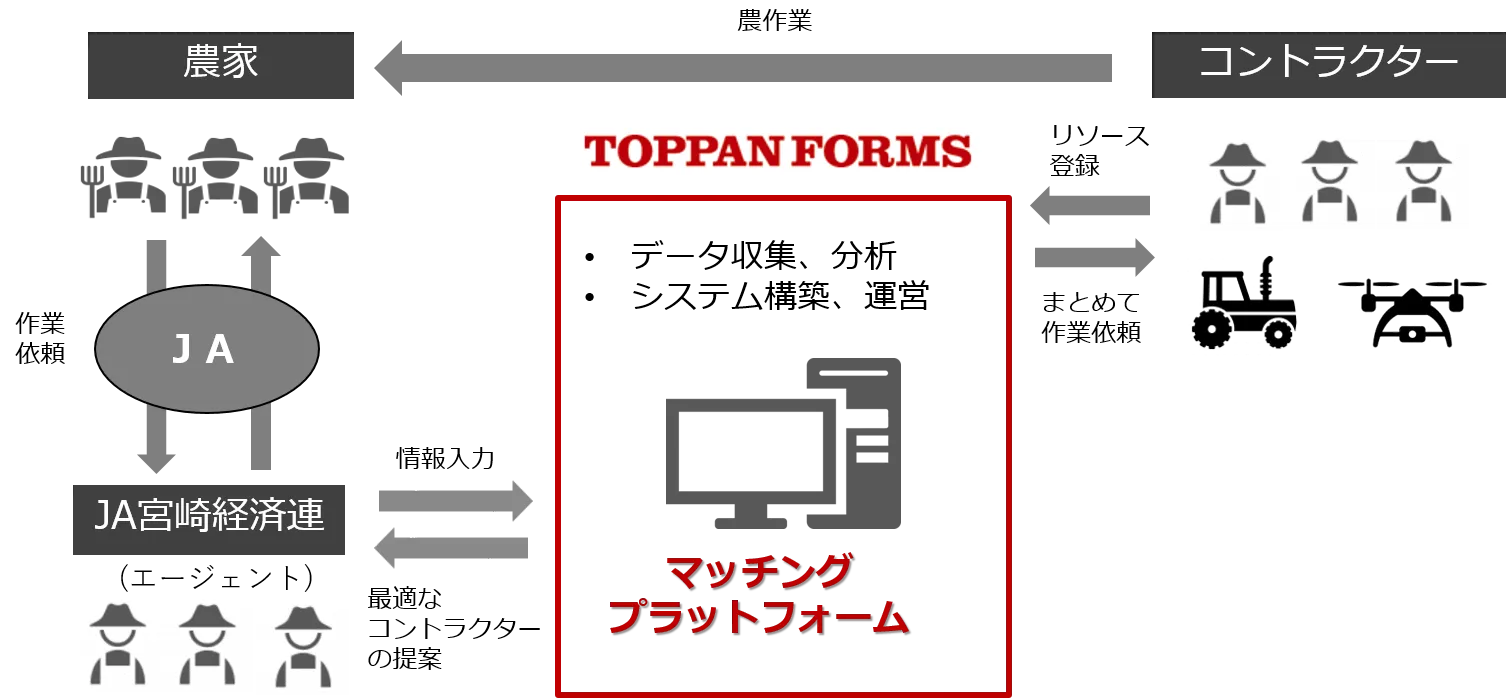 デジタルハイブリッドのトッパン・フォームズ株式会社(以下トッパンフォームズ)は、社会課題解決を起点とした新事業の創出に取り組むフロンティア領域の一つとして農作業マッチングサービスの実証を開始しました。トッパンフォームズが、企業のデジタルトランスフォーメーション(DX)支援として請け負っている事務処理代行や地方自治体で事務効率化による生産性向上と業務負荷の軽減を目指して採用しているBPM(Business Process Management)の手法を農作業に適用しています。BPMは業務プロセスを細分化し、各工程を分析して全体最適で業務を再構成する手法です。対象となる農作業の内容や農地条件などから最適な農業法人(コントラクター)と利用農機具を選定し、エージェントを介して作業代行を提案します。第一弾として、既に生産者の労力軽減に向けた作業分業化の取組みを進めていた宮崎県経済農業協同組合連合会(以下 JA宮崎経済連)にご協力をいただき、地域のJAに所属する農家の作業の一部工程を、最適と思われる農機具とノウハウを保有するコントラクターであるベジエイト株式会社(宮崎県都城市)に委託する形で11月からサービスを開始しました。本サービスは2022年度からの本格展開を予定しています。