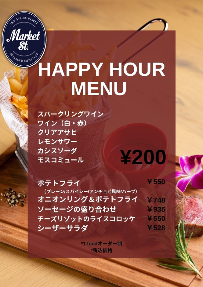 暑い夏も終わってしまいましたが、まだまだ残暑が残るこの季節。仕事上がりや早めに少し飲んでゆっくりしたい方、お友達と少し飲んで早めに帰宅したい方。皆様にスペシャルプライスでお届けする、マーケットストリートbyイビススタイルズ名古屋の美味しいお酒と1品をどうぞ。