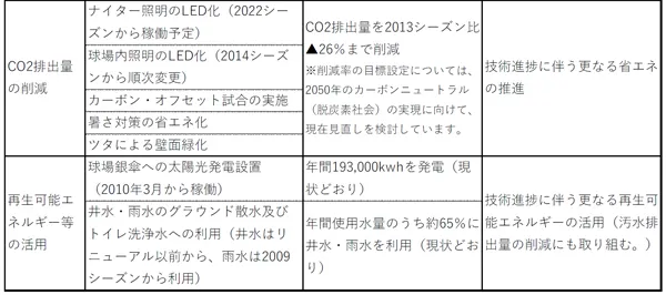 当球場では既に、2007~2009年に実施したリニューアル工事の際に「環境への配慮」を掲げ、銀傘(球場の大屋根)への太陽光発電の設置、雨水・井水の利用、プラスチックカップのリサイクル等に取り組んでまいりましたが、今回の宣言では、3つのテーマを設定し、テーマ別の取組みに一層の充実を図ることで、事業活動を通じた環境負荷の更なる低減を目指します。