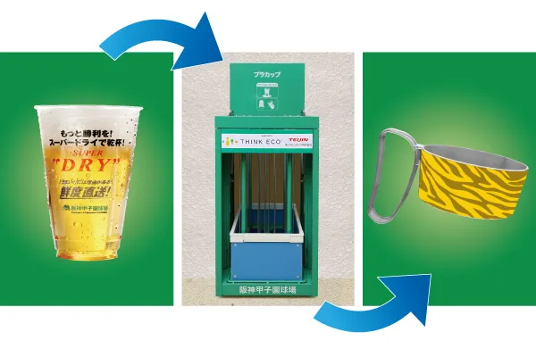 2012年から、球場内で使用後のポリエステル製ビール用プラスチックカップを、帝人フロンティア(株)と共同で分別回収し、球場イベントで配布されるノベルティなどにリサイクルする取組みを行ってきました。お客様に向けた回収協力の呼びかけを強化すること等により、現在約25%(約7トン)である回収率を更に向上させ、リサイクル製品の用途拡大を図ります。