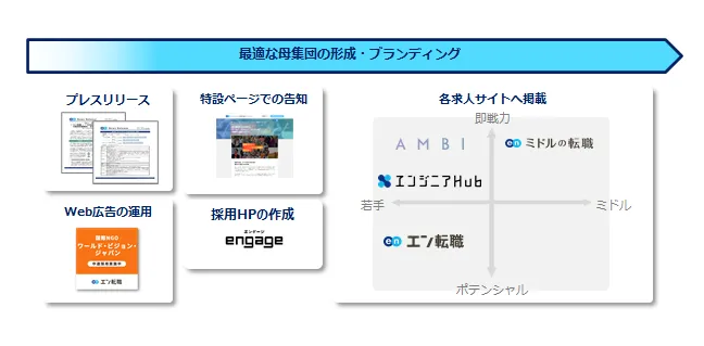 プレスリリースや特設ページ、採用HPの作成、Web広告を用いた告知に加え、各求人サイトでの集客サポートを実施いたします。『エン転職』『AMBI』『ミドルの転職』『エンジニアHub』とターゲットの異なる4つの求人サイトを活用することで、ターゲットへ網羅的に求人を届けます。また、採用ターゲットの策定から選考のアドバイスまで、全面的にサポートいたします。