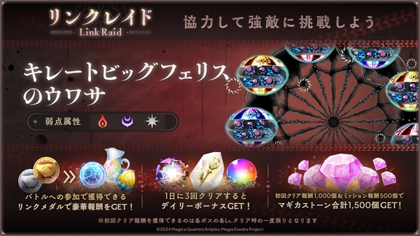 12月18日(木)12時より、リンクレイドを開催いたします。BOSSには「キレートビッグフェリスのウワサ」が再び登場します。シーズンミッションクリアなどでマギカストーンを獲得いただけます。