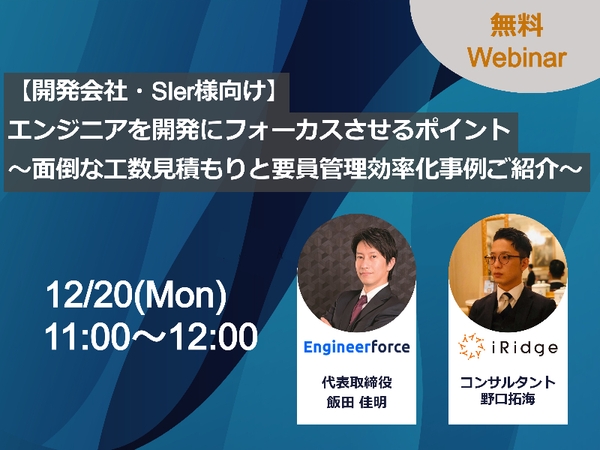 株式会社Engineerforce(本社:東京都渋谷区、代表取締役:飯田 佳明)は、株式会社アイリッジ(本社:東京都港区、代表取締役:小田 健太郎)と共同で2021年12月20日に『エンジニアを開発にフォーカスさせるために押さえるべきポイント ~面倒な工数見積もりと要員管理の効率化事例のご紹介~』の無料ウェビナーを共同開催することをお知らせいたします。