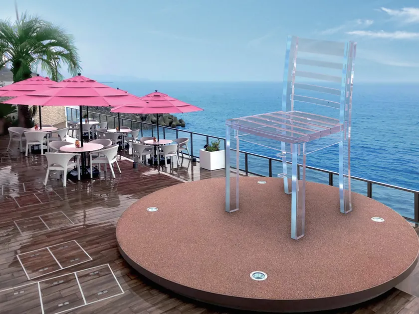 「幸せの椅子」は淡路島西海岸に面したビーチテラス席に設置しており、高さ3mの透明な素材の椅子に腰かければまるで空中に座っているように、更に夕日をバックに撮影すればインスタ映え間違えありません。
