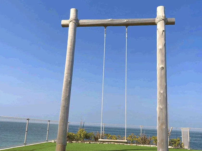 青い海と青空に映える大きな丸太のブランコが目印。