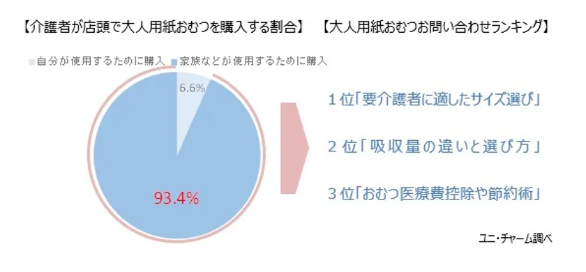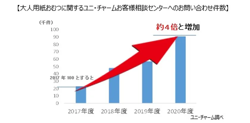 日本人の平均寿命が80歳を超えるなか、厚生労働省は「健康寿命の延伸」を掲げています。一方で、老化に伴う筋力の衰えから、「食事・入浴・排泄」の支援や介護を必要とする高齢者は増加傾向にあります。そこで当社は、お客様相談センター(いきいきダイヤル)に加えて、2018年よりチャットボットを採用した「大人用おむつNAVI」を開設し、24時間お問い合わせ可能な環境を整えてきました。その結果、お問い合わせ件数は毎年増え続け4年間で約4倍となりましたが、そのうち約6割が紙おむつの「適切な商品」や「最適なサイズ」に関する問い合わせであることがわかりました。また、大人用紙おむつの購入を目的に来店した方の約9割が介護者で、要介護者へ相談しないまま普段の洋服や下着のサイズを参考に紙おむつを購入していることから、適さないサイズの紙おむつを使用している要介護者は約4割にのぼることがわかりました。