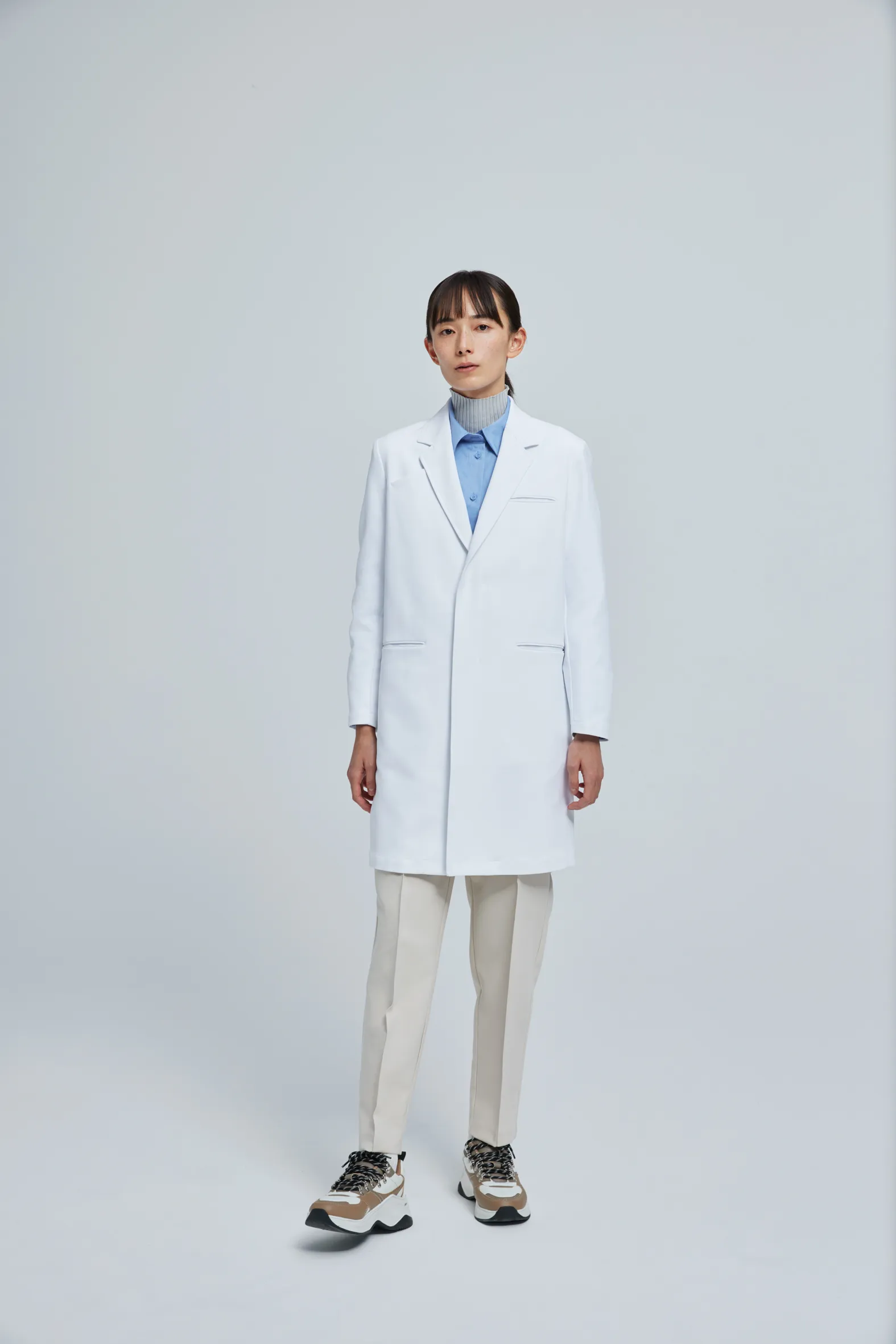 生地には上質感と快適さを最も追求したハイエンド素材「urban tech」を採用。着心地の良さに加えて、ストレッチ、 ノンアイロン、透け防止、吸水速乾、静電防止、軽量、衿裏汚れ防止の高機能も網羅する白衣です。