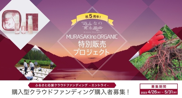 プラスソーシャルインベストメント株式会社(代表取締役社長 野池雅人、京都市上京区、以下PSI)は、株式会社みんなの奥永源寺(代表取締役 前川真司、滋賀県東近江市、以下みんなの奥永源寺)をプロジェクトオーナーとする購入型クラウドファンディング「祝5周年!『MURASAKIno ORGANIC』特別販売プロジェクト」(目標金額2,000,000円、募集最高金額3,025,000円)の募集を、2023年4月26日からふるさと応援クラウドファンディング「エントライ」で開始します。