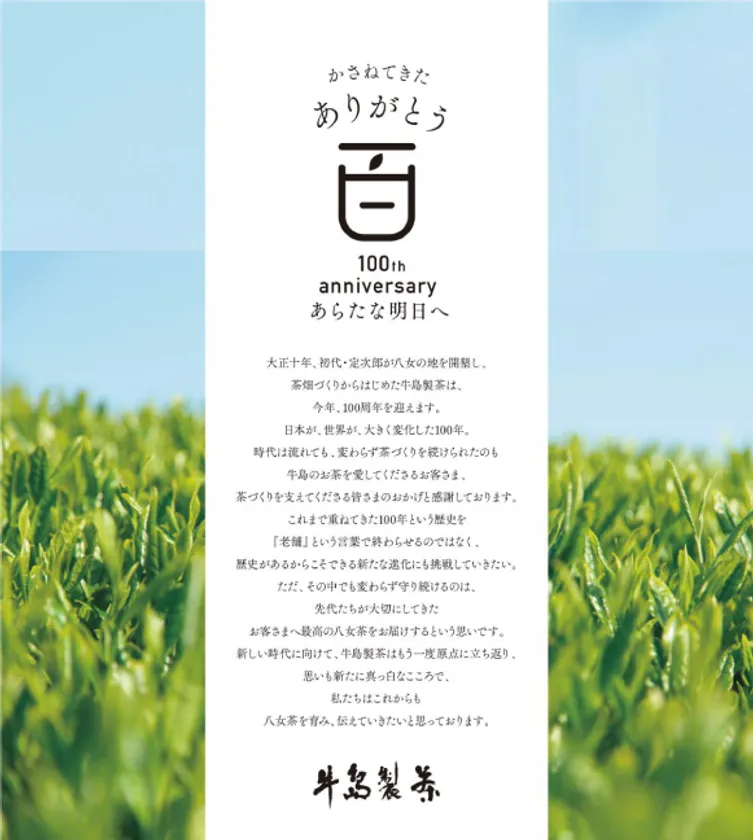 これまで重ねてきた100年という歴史から当店はよく「老舗」とよばれますが、次の新たな歴史を作るために「温故知新」新たな挑戦が必要と考えてます。そんな想いから次の100年に向け、もう一度原点に立ち返り、真っ白なこころで、故郷の宝「八女茶」を育み、磨きあげ伝え続けていきたいと思います。
