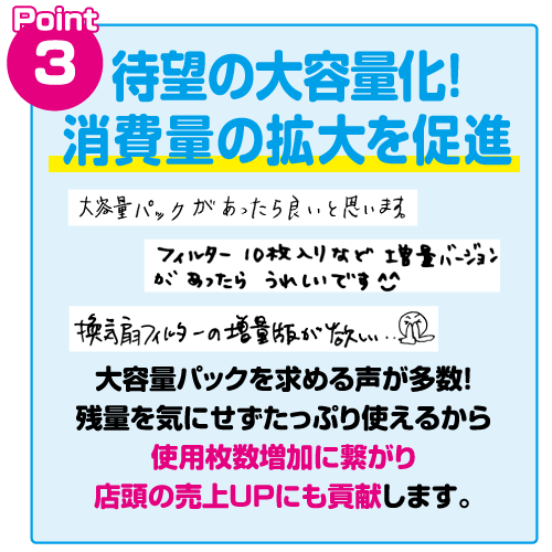 衛生面に対する意識の高まりや換気・掃除の習慣化により、売り上げを伸ばしている人気商品「ホコリとりフィルター換気扇用」は、弊社販売商品売上No.1の実績と使用者の再購入意向98.6%*1という高い満足度を誇ります。この商品は、シールのように貼るだけで、ホコリが溜まったらはがすだけという手軽さが魅力の予防掃除商品です。交換頻度が高いため、お客様のご要望にお応えし、人気の15㎝サイズと30㎝のフリーサイズの入り枚数を3倍にした大容量パックを新発売いたしました。