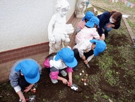 園内の一角に子どもたちと一緒に花壇をつくります。土や植物、生き物に触れられる空間を創出することで、子ども達のウキウキ・ワクワクを引き出します。