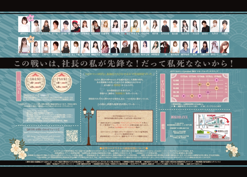◇脚本・演出: 佐藤颯(ぱすてるからっと) / ◇ダンス振付: 熊里あかり、井上四葉、岡ちひろ / ◇制作: 宮沢雪乃、よしざわちか、井上千鶴、美月まりも / ◇殺陣振付・指導: 小野祐輔 / ◇舞台・大道具: (株)BAKU建築研究室、タフゴング / ◇舞台監督: 戸上未勇 / ◇舞台映像: 坂内友樹(ビッグバンバン) / ◇照明: 一場美紀(ディスカラーカンパニー) / ◇音響: 御供田沙央理 / ◇楽曲製作・歌唱: 中島亮、岡ちひろ、杉田真帆 / ◇広告デザイン: 佐藤博久、東藤未沙 / ◇ビジュアル撮影・パンフレット: 河上綾伽 / ◇企画: ぱすてるからっと