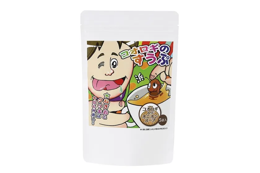 1食(6g)につき国産コオロギの粉末が約3匹入っております。味は淡路島産玉ねぎのスープをベースにして飲みやすくしました。余計な素材は入れずに、シンプルな原材料にしてつくっています。パッケージデザインは人間(ねぎお)とコオロギ(クリ太)が仲良しなのをイメージをしてデザインしました。
