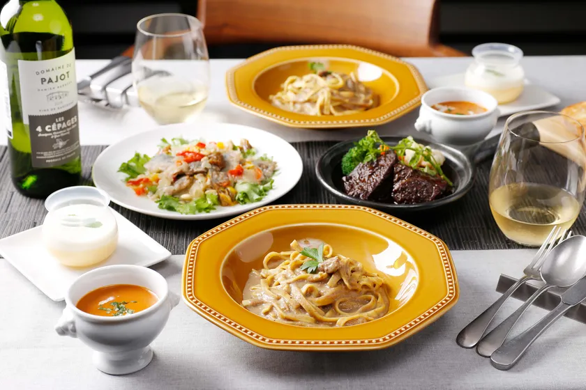 甘みと酸味のバランスが絶妙な奥出雲高原トマトの瑞々しい味わいを最大限に活かしたトマトソースをメインに、それぞれ素材にこだわった前菜、スープ、デザートを揃えたランチコース仕立てのセットです。