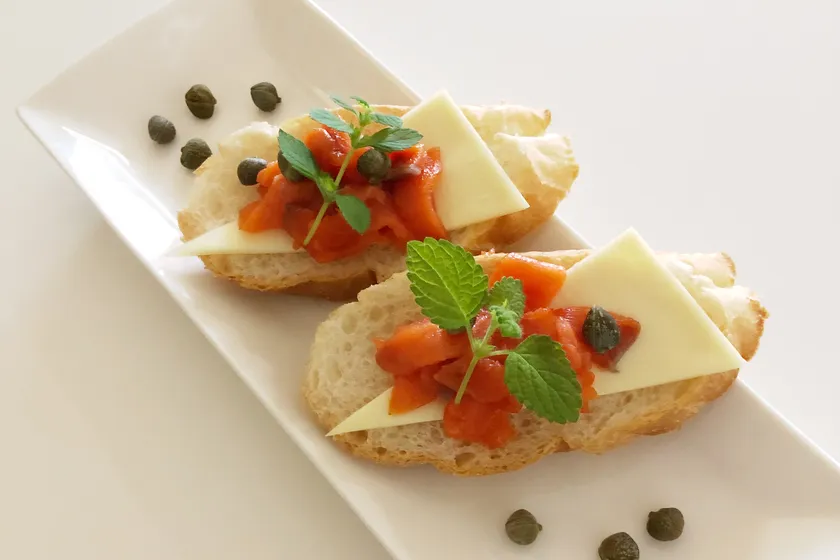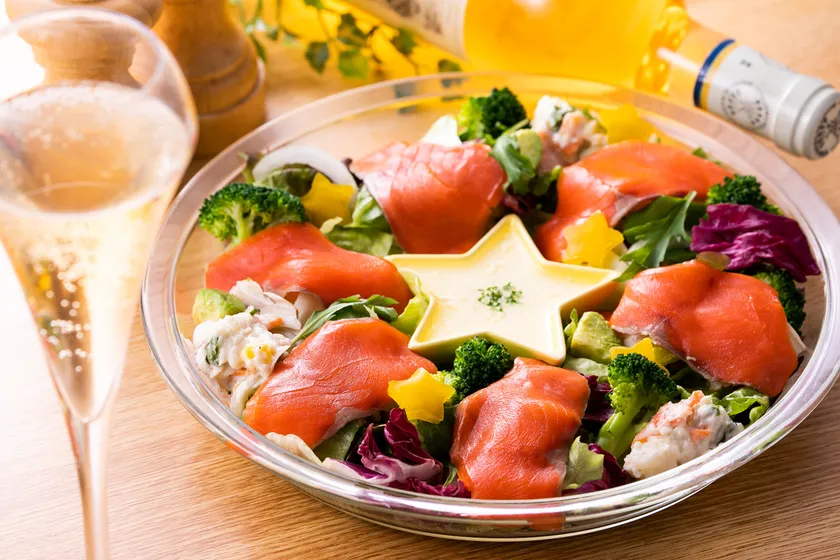 天然紅鮭スモークサーモンの特徴といえば鮮やかな「紅色」。そこに野菜の「緑」とポテトサラダの「白」を加えれば、あっという間にXmasカラーの一皿が出来上がります。