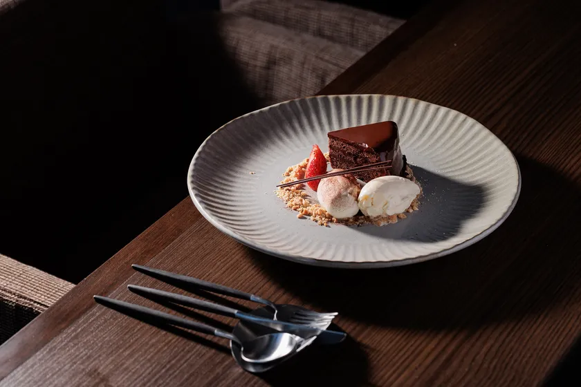 当店のカフェスペースにて、特別メニューとしての贅沢なザッハトルテを、プレートに施されるチョコレート職人のこだわりの装飾と共にお楽しみください。