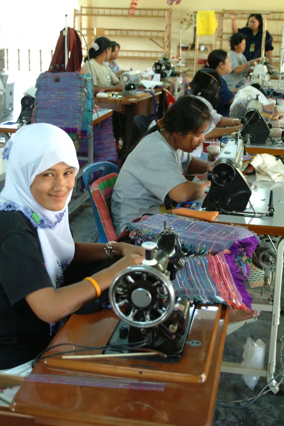 タイ南部のパンガー県の2004年インド洋大津波に被災した女性たちのグループが、織りから縫製までを行って作っています。