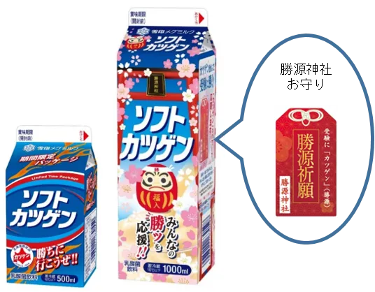 雪印メグミルク株式会社(本社:東京都新宿区、代表取締役社長:西尾 啓治)は、『ソフトカツゲン』(500ml、1000ml)を2021年12月21日(火)より2022年3月上旬(予定)までの期間限定で、“受験生応援パッケージ” (500ml:「勝ちに行こうぜ!!」、1000ml:「勝源神社」の鳥居とだるま)を展開いたします。