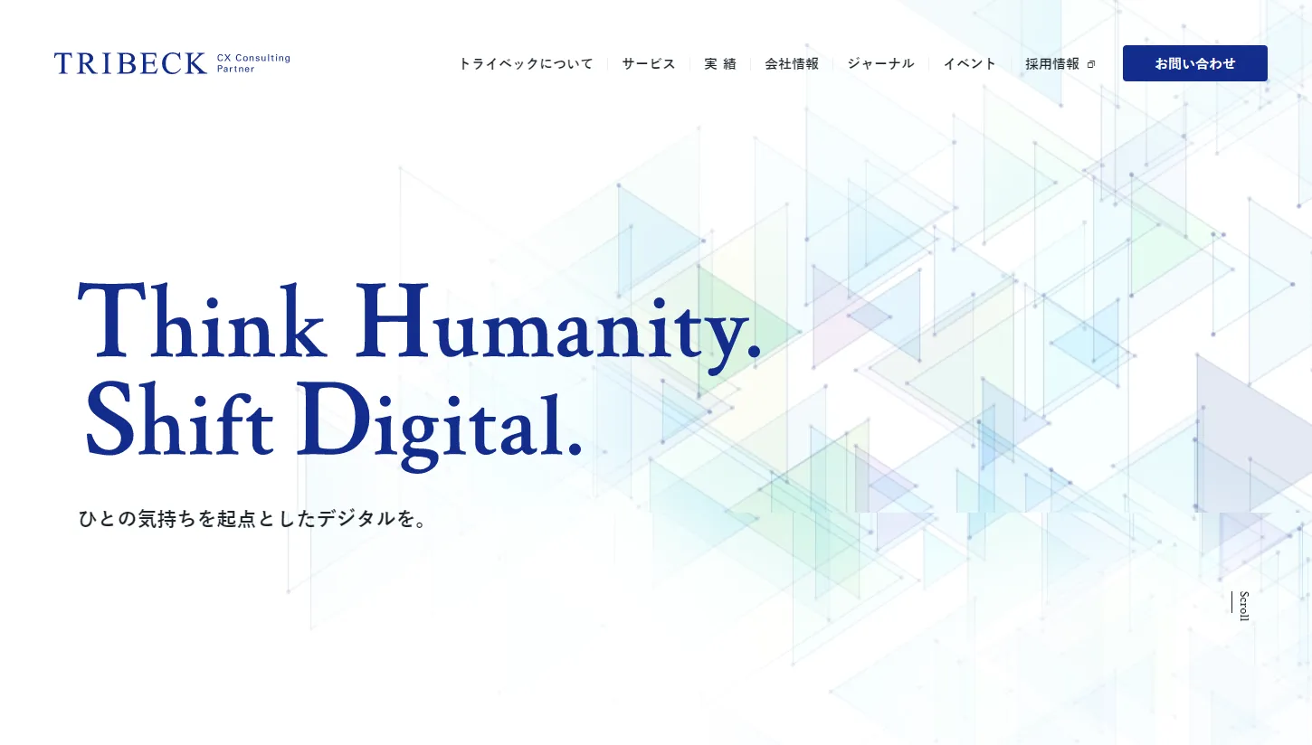 デザインを刷新するにあたっては、経営陣へのヒアリングをはじめ、各事業部の主要メンバー、外部制作会社と綿密なワークショップを繰り返し、自社の分析を徹底的に行いました。トライベックの「ひとの気持ちを起点として、デジタルで身近なストレスを解消し、誰に対してもやさしい未来を創る」という企業パーパスを「Think Humanity. Shift Digital.」というメッセージに集約し、さらにサービスの訴求の仕方やトライベックらしいデザインとは何かを突き詰め、新しいサイトに実現しました。