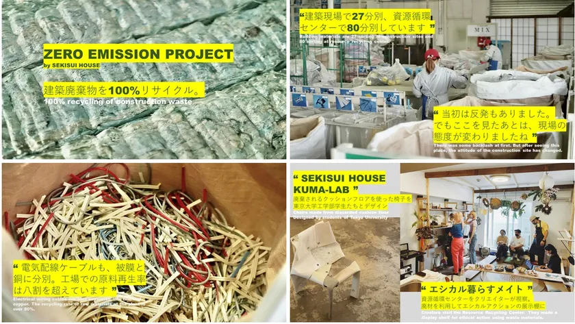 その他、2021年6月実施、次世代クリエイターと環境アクションを考える「エシカル暮らすメイト」での廃材利用家具制作や、隈研吾氏を特別教授に迎えたSEKISUI HOUSE KUMA-LABにおいて、東京大学工学部の学生たちと廃棄素材を使った椅子のデザインを行うなど、若い世代へのサーキュラー・エコノミーの考えに触れる取り組みとしても、当社のゼロエミッションは活用されています。