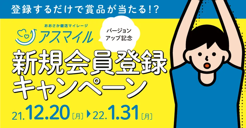 大阪府が提供する健康アプリ「アスマイル」は、2021年12月20日(月)より、新規会員登録をいただいた方の中から抽選で、素敵なプレゼントが当たるキャンペーンを実施いたします。