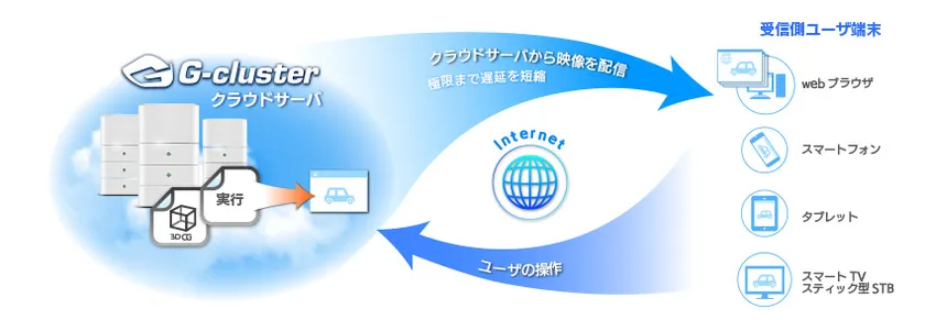 Gクラスタは、サーバサイドですべての処理を行うクラウド配信技術です。インターネット接続を介して、「操作」と「映像の配信」の双方向のやり取りが可能なコンテンツを配信するストリーミングサービスを構築します。マルチデバイスに対応、端末のストレージ空き容量を気にせずに、手軽に双方向のやり取りを実現します。