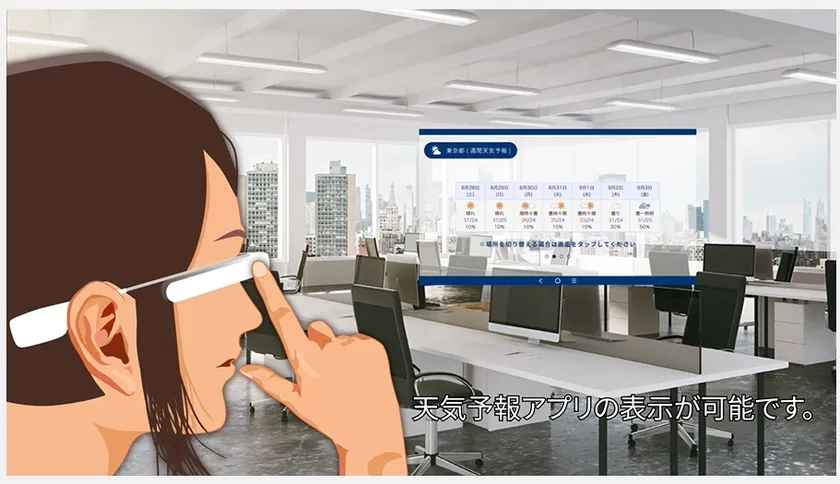 提供開始したアプリケーションは、時計(日付&時間)、天気予報(地震速報)、Googleカレンダーを表示できるほか、写真/動画をGoogleドライブに保存する機能。今後、チャット連携、社内システム連携、テレビ会議による接客販売、トランシーバーなど、各種機能を開発・拡充していく計画です。