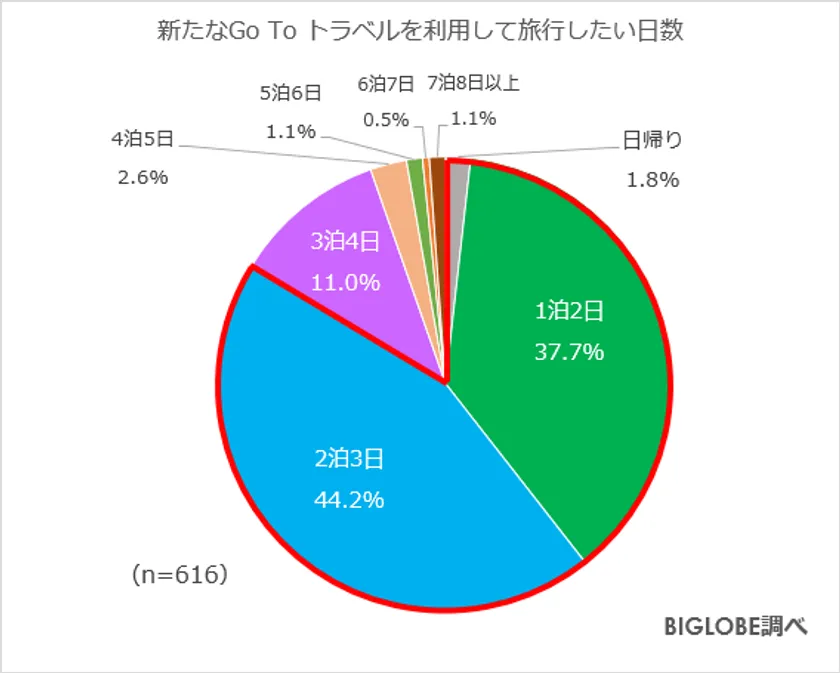 旅行したい日数は、2泊3日(44.2%)、次いで1泊2日(37.7%)となった。旅行日程が3日以内のプランが全体の8割以上を占めた。