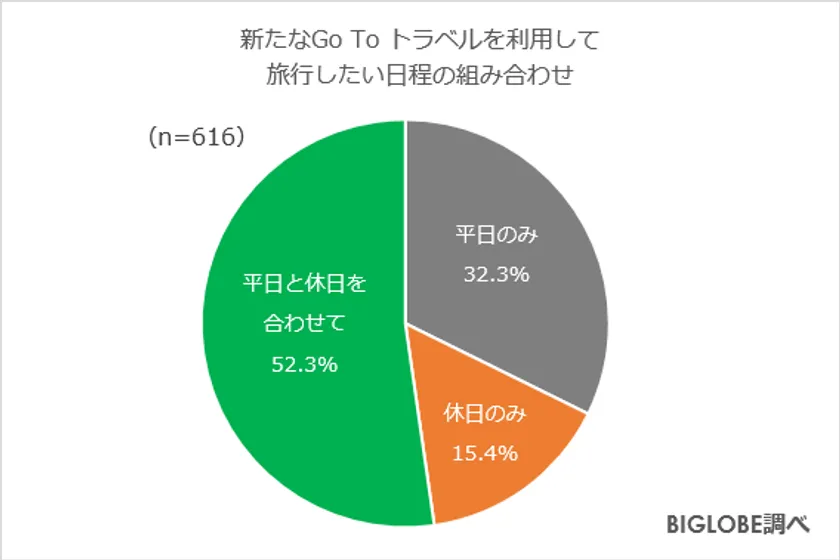旅行したい日程の組み合わせでは、「平日と休日を合わせて」(52.3%)が全体の半数近くを占めた。「休日のみ」と回答した人は15.4%と低い割合となった。