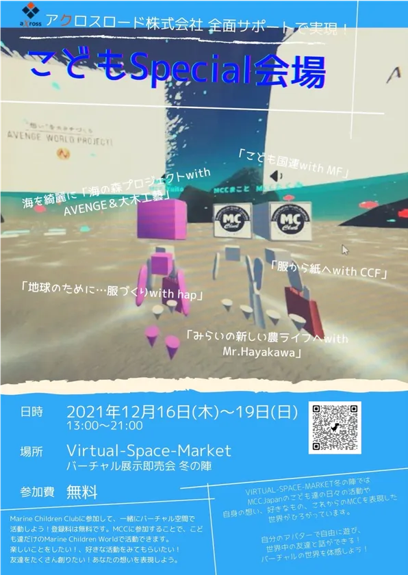 アクロスロード株式会社(所在地:東京都品川区、代表取締役社長:津田 徹)が運営するバーチャル空間VIRTUAL SPACE MARKET(バーチャルスペースマーケット)で開催される「Vマ+バーチャル異空間即売会 2021 冬の陣」の展示会会場に設置された、30個のブースが並ぶ1つの空間を、地球貢献活動を行っているマリンチルドレンクラブ(以下、MCCと称す)の子供たちがプロデュースしてくれました。子供たちが子供のために作り上げたメタバース空間です。「Vマ+バーチャル異空間即売会2021 冬の陣 マリンチルドレンクラブわいわいバーチャル広場」は2021年12月16日~19日の4日間で開催いたします。