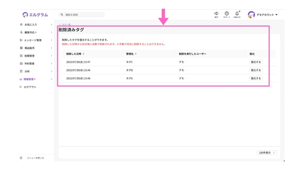 従来の「エルグラム」では、データを削除すると即時反映され復旧ができませんでした。しかし、今回のアップデートにより、削除されたデータは「削除済みデータ」として90日間保管されるようになりました。
