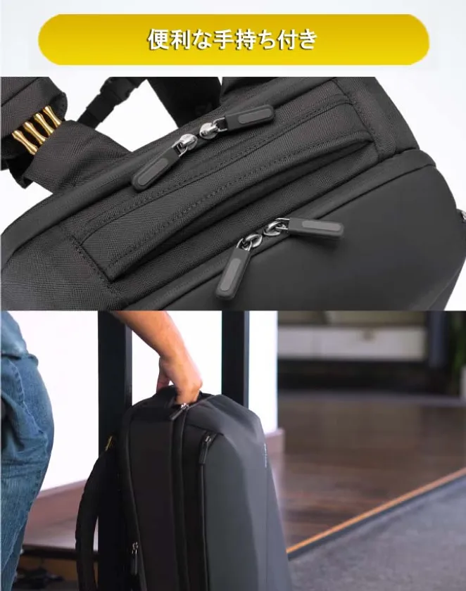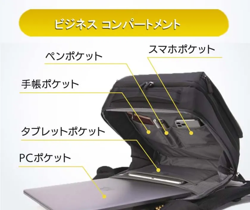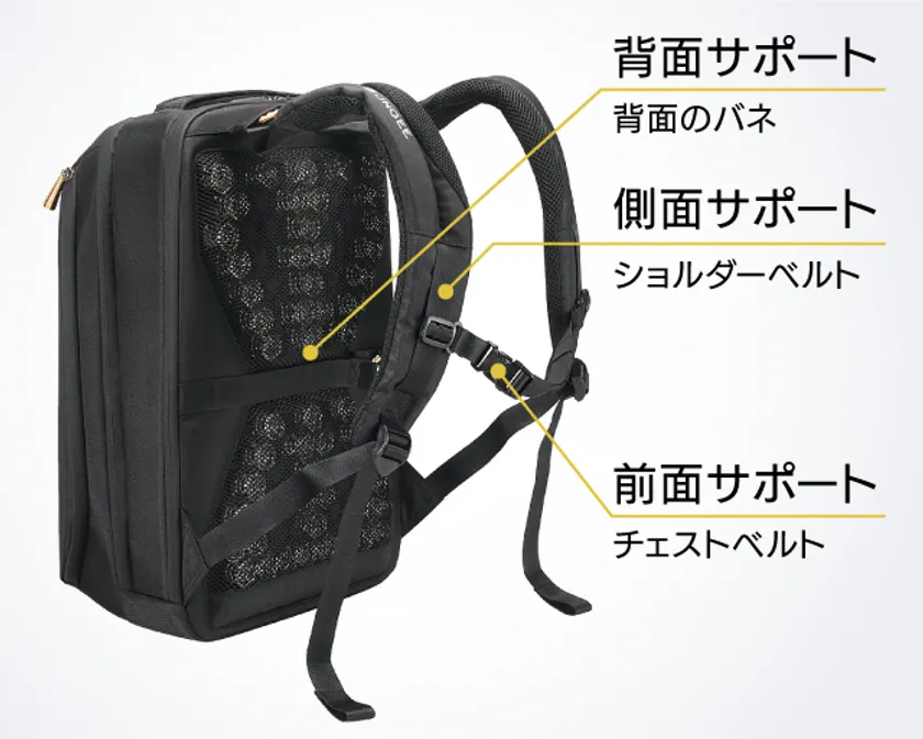 夏のバックパックで気になる「背中びじょびじょ問題」。を、バネで劇的改善。大容量バックパックにこそ必要な機能です。商談先で背中の汗しみや臭いに気を取られることなく、ビジネスに集中できます。