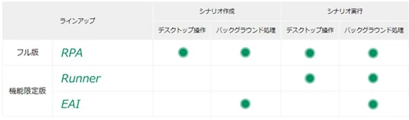・Owlgarden同様に、機能フル版の「RPA」、限定版「Runner」、「EAI」の3つのラインナップをご用意