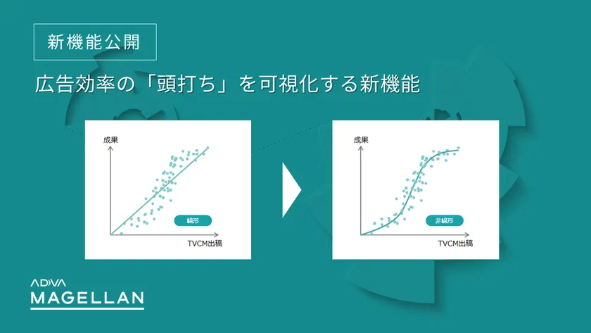 株式会社サイカ(本社:東京都千代田区、代表取締役CEO:平尾 喜昭、以下 サイカ)は、2021年12月20日より、ADVA MAGELLAN(以下、アドバ マゼラン)に、広告出稿を続けた際に発生する広告効率の頭打ち(※1)を可視化する新機能(非線形分析機能)を実装しました。この新機能により、企業は、従来主流である線形分析では困難だった広告効率の頭打ちを可視化し、より正確な広告効果および最適な予算配分を明らかにすることが可能となります。